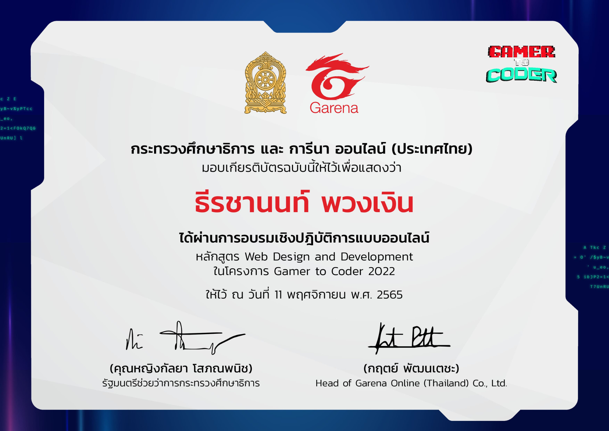 - เข้าร่วมการอบรมเชิงปฎิบัติการ (Garena Gamer To Coder 2022)